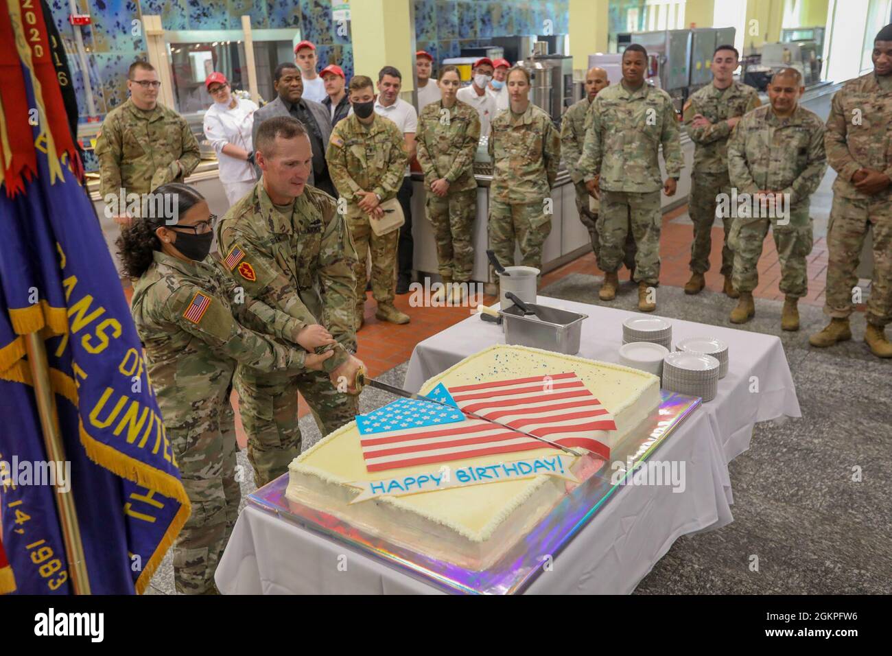 U S Army Pfc Angela Orenco And U S Army Sgt Maj David Bowen With The 1st Combat Aviation Brigade Cut The Army Birthday Cake In Celebration Of The Army S 246th Birthday At Storck